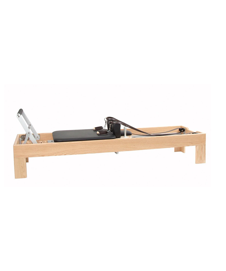 Built with handcrafted solid beechwood, this reformer provides a strong and stable platform for classical Pilates work. It features the rope and riser system, enabling easy transitions and adjustment. The redesigned carriage is ready for potential tower or mat system upgrades.