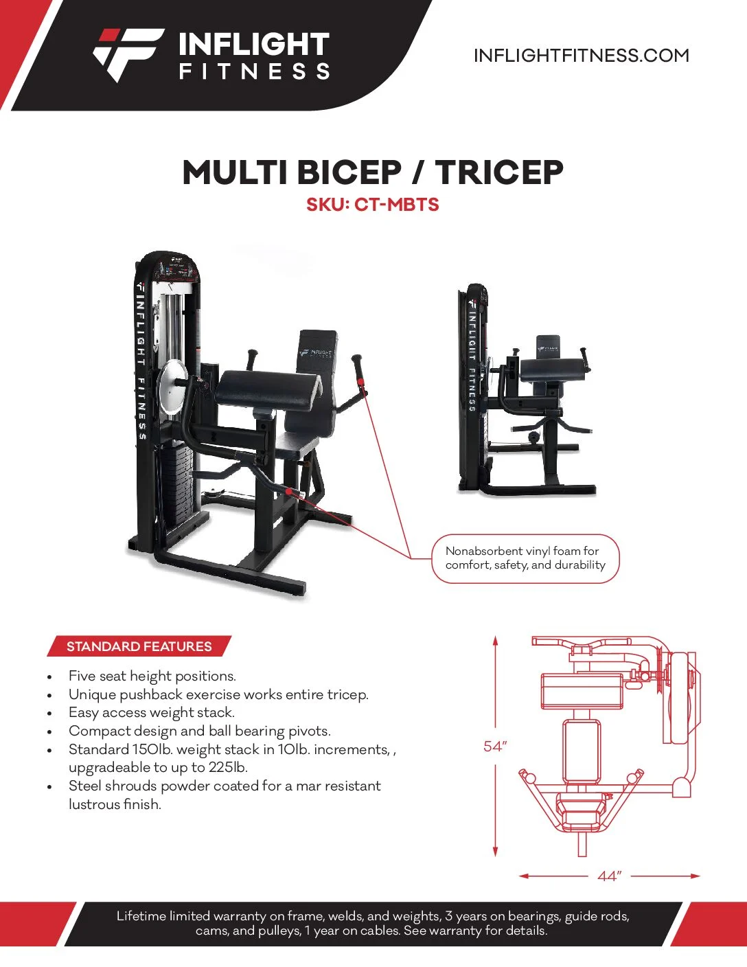 Sale Inflight Multi Bicep / Tricep$3,789.00 Original price was: $3,789.00.$3,435.00Current price is: $3,435.00. Talk to an expert Specifications: Five seat height positions. Unique pushback exercise works entire tricep. Easy access weight stack. Compact design and ball bearing pivots. Inflight Multi Bicep / Tricep quantity Add to cart SKU: CT-MBTS Categories: Inflight Fitness, Strength Brand: Inflight Fitness Description Description Standard 150lb. weight stack in 10lb. increments. Steel shrouds powder-coated and clear-coated for a mar-resistant lustrous finish. Related products PMX/StrengthCM-705 2-TOWER 5-WEIGHT STACKS $11,560.00 Add to cart PMX/StrengthP-235-2 4 STACK MULTI-GYM $13,270.00 Add to cart PMX/Cross-Training/StrengthEqualizer 4 $8,620.00 Add to cart