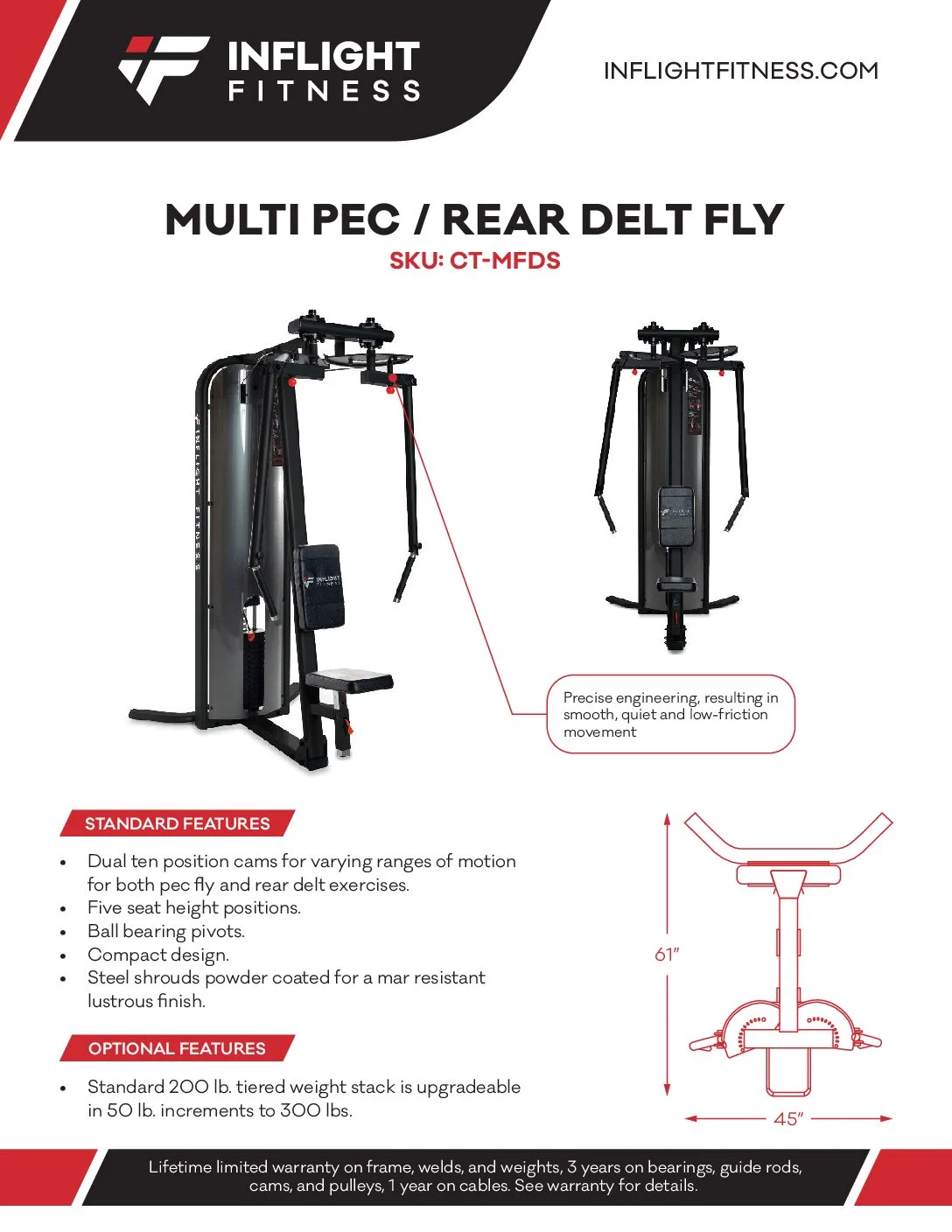 Sale Inflight Multi Pec / Rear Delt Fly$3,890.00 Original price was: $3,890.00.$3,535.00Current price is: $3,535.00. Talk to an expert Specifications: Dual ten position cams for varying ranges of motion for both pec fly and rear delt exercises. Five seat height positions. Ball bearing pivots. Compact design. Inflight Multi Pec / Rear Delt Fly quantity Add to cart SKU: CT-MFDS Categories: Inflight Fitness, Strength Brand: Inflight Fitness Description Description Steel shrouds powder-coated and clear-coated for a mar-resistant lustrous finish. Standard 200 lb. tiered weight stack is upgradeable in 50 lb. increments to 300 lbs. Related products PMX/StrengthRaptor Vertical Chest Press, Pec Fly – 250lb. Weight Stack $3,995.00 Add to cart PMX/StrengthRAPTOR P-1100 REAR DELTOID / PECTORAL FLY $3,995.00 Add to cart SaleInflight Fitness/StrengthInflight Multi Press $4,000.00 Original price was: $4,000.00.$3,635.00Current price is: $3,635.00. Add to cart