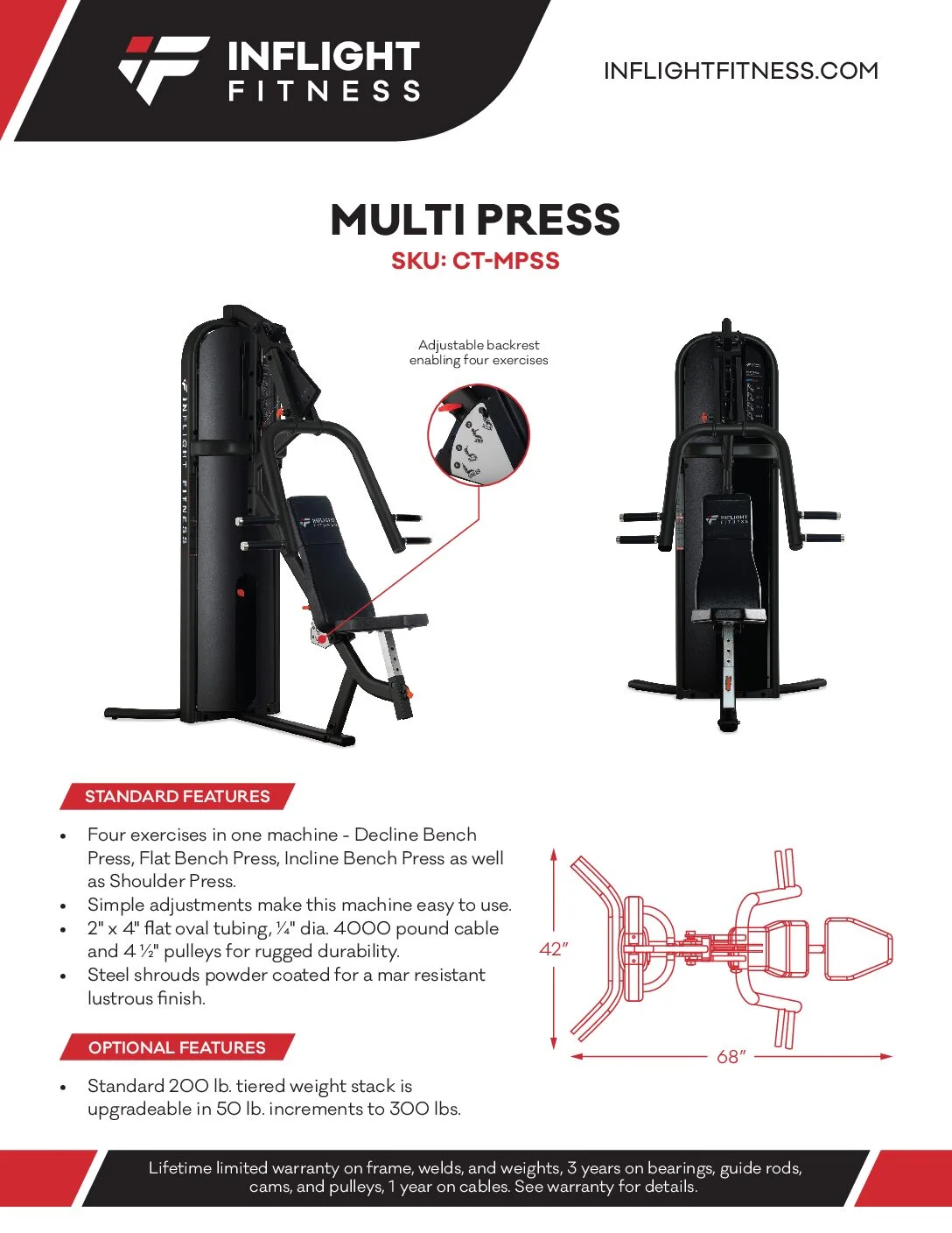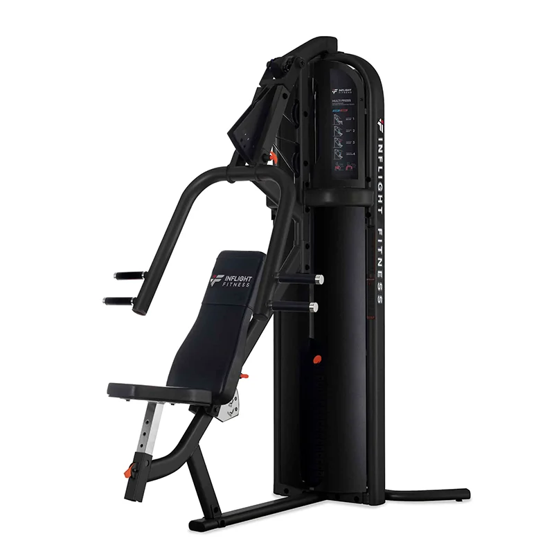 Sale Inflight Multi Press$4,000.00 Original price was: $4,000.00.$3,635.00Current price is: $3,635.00. Talk to an expert Specifications: Four exercises in one machine – Decline Bench Press, Flat Bench Press, Incline Bench Press as well as Shoulder Press. Simple adjustments make this machine easy to use. 2” x 4” flat oval tubing, ¼” dia. 4000-pound cable and 4 ½” pulleys for rugged durability. Inflight Multi Press quantity Add to cart SKU: CT-MPSS Categories: Inflight Fitness, Strength Brand: Inflight Fitness Description Description Steel shrouds powder-coated and clear coated for a mar-resistant lustrous finish. Standard 200 lb. tiered weight stack is upgradeable in 50 lb. increments to 300 lbs. Related products Cross-Training/PMX/StrengthEqualizer 5 $9,078.00 Add to cart SaleInflight Fitness/StrengthInflight Multi Bicep / Tricep $3,789.00 Original price was: $3,789.00.$3,435.00Current price is: $3,435.00. Add to cart SaleInflight Fitness/StrengthInflight Multi Seated Leg Curl Extension $4,445.00 Original price was: $4,445.00.$4,040.00Current price is: $4,040.00. Add to cart