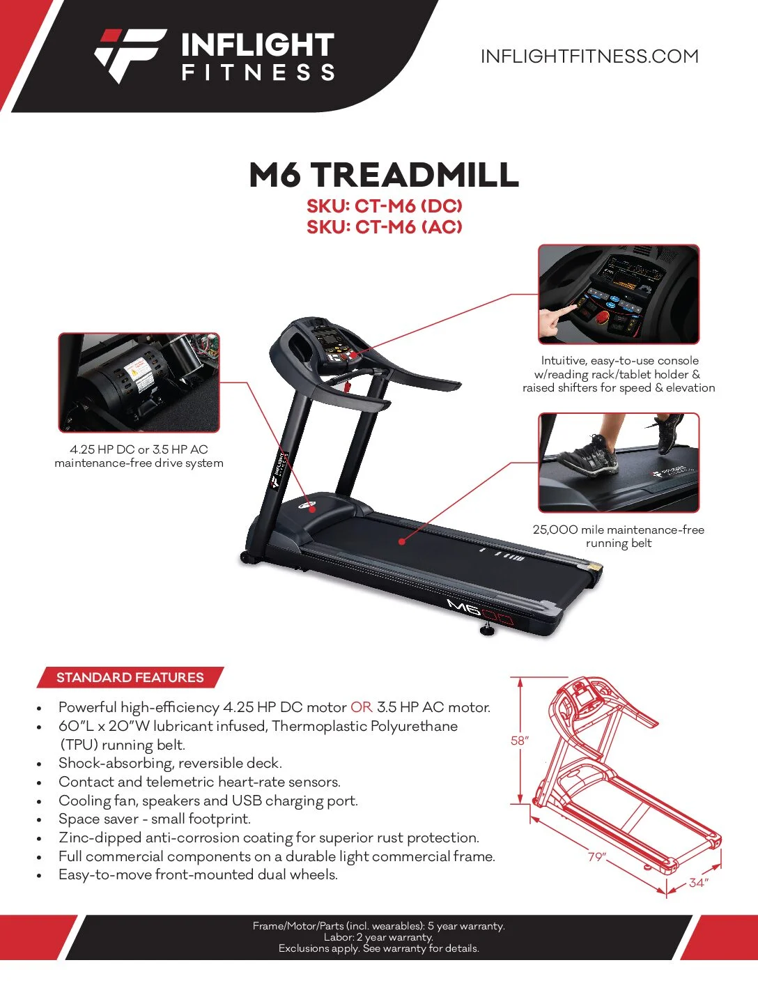 The M6 also features a maintenance-free shock-absorbing deck, designed for optimal performance and comfort during every workout. Enjoy additional features like contact and telemetric heart rate sensors, a cooling fan to keep you refreshed, built-in speakers, and a USB charging port to power your devices as you train.